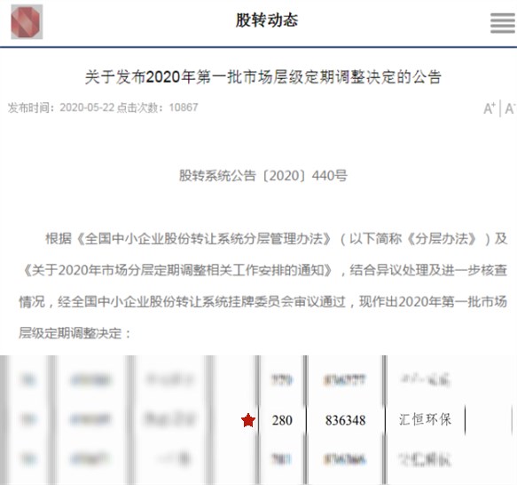 2020年汇恒环保进入创新层